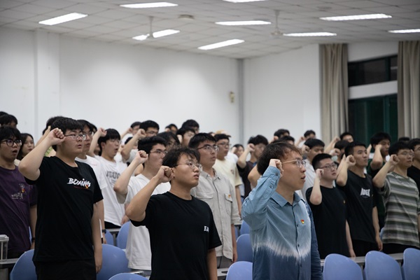 会议伊始,何小龙介绍活动的主要形式和内容,安排回顾党的光辉历程、重温入党誓词等环节,旨在进一步引导学生党员坚定不移听党话,矢志不渝跟党走,筑牢对党忠诚的政治品格。随后,穆海涛向学生党员讲授以“学思践悟守初心,挺膺担当励青春”为主题的党课,他表示:“我们全体党员要把马克思主义作为看家本领,在书本上学,在实践中学,贯通源流根脉,掌握新时代党的创新理论的世界观和方法论,自觉用中国化时代化的马克思主义指导新的实践。全体学生党员在学习生活中要少一些抱怨,发挥自身的主观能动性,主动探索、寻找解决问题的方法,要相信困难的事情总会迎来转机。”穆海涛强调,学生党员要端正干事创业态度,主动培养良好习惯,奏响爱党、爱国、爱社会主义的时代强音。最后,学生会主席严子昕带领全体党员重温入党誓词,一同叩问初心、守护初心,立志在中国式现代化建设中挺膺担当!