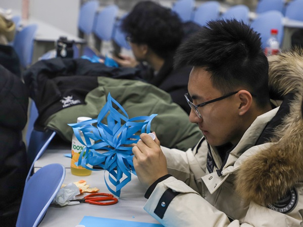 活动开始,由剪纸爱好者协会负责人王牧晗为参与活动的学生介绍剪纸的历史和文化背景,并教授了本次剪纸体验互动的作品制作流程,即使用提供的彩纸和剪刀、刻刀等工具,制作与大雪节气十分相称的“纸雪花”。完成雪花作品制作后,学生依次领取白色卡纸,挑选不同色彩的彩笔来绘制大雪、冬日主题的画作,留作纪念。活动过程中,学生利用手头材料,两人一组,积极协作,纷纷制作出了属于自己的剪纸作品,不少学生在卡纸上完成了属于自己的画作。在活动最后,参与活动的学生们互相展示自己的作品,大家一起合影留念。活动结束后,学生会成员王昱皓表示:“本次活动选在大雪这个节气,形式为传统的剪纸艺术,具有浓厚的文化气息,旨在让同学们在繁杂的学习生活中收获到一份平静。”