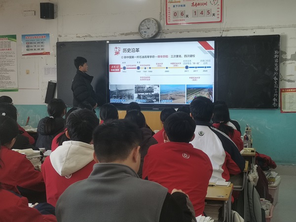 王晓冉着重介绍了学校优美的校园环境,包括石大四季的风光,以及太阳女神、图书馆、逸夫楼等标志性建筑,引得学生们阵阵惊叹。接着,她又详细讲解了石大历年招生情况和分数线,并为有志报考石大的学生提出了切实可行的建议。王思涵则聚焦高中生的压力及解决办法,根据自身高三经历,深入剖析高中生面临的压力和负担,一一给出解决方法。这不仅解决了学生们的困扰,还增强了他们的自信心。宣讲结束后,大家为学生们送上了最真挚的祝福,并一起合影留念,现场洋溢着温暖的氛围。