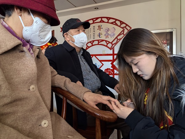 上午9时,支部成员们在老年公寓活动厅进行文艺汇演。学生们以《打靶归来》《社会主义好》等经典红歌联唱开场,质朴的歌声唤醒老人们尘封的记忆。尽管没有专业音响设备,青年学子们用真挚的情感构筑起跨越半个世纪的情感纽带。活动中,不少老人主动加入合唱,现场氛围温暖而热烈,在汇演进行的同时,其他学生则入座为老人们细心地修剪指甲。