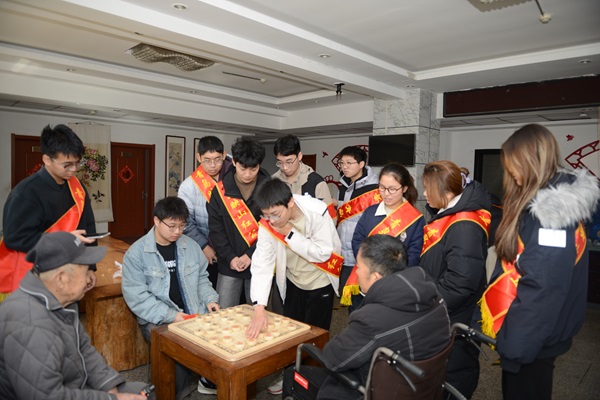 志愿者在养老院与老人对弈 王鑫玥摄