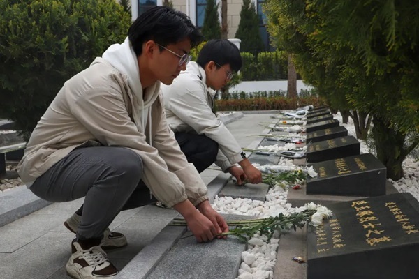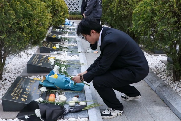 默哀结束后,同学们手捧鲜花依次走向烈士墓碑,轻轻献上鲜花并鞠躬致敬。每一座墓碑背后都是一段可歌可泣的故事,同学们通过实际行动表达了对革命先烈的崇高敬意,深刻地感受革命先烈为人民事业献身的伟大精神。