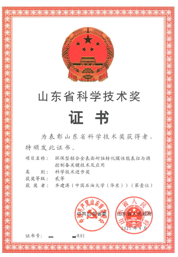 6月27日,全省科技大会在济南召开,表彰2024年度山东省科学技术奖获奖者。我院齐建涛副教授作为首位完成人主持的“环保型轻合金表面耐蚀转化膜性能表征与调控制备关键技术及应用”项目,荣获山东省科学技术进步奖二等奖,该项目在新能源材料与绿色制造技术领域取得创新突破。