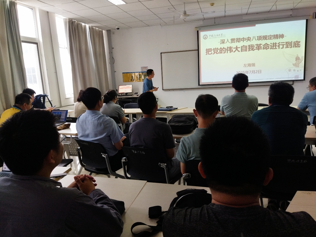 接下来,按照学校、学院党委关于持续抓好中央八项规定精神学习教育的部署安排,支部书记左海强主讲以“深入贯彻中央八项规定精神,把党的伟大自我革命进行到底”为题学习教育专题党课,他首先引用了中央纪委国家监委公布的 2025 5 月全国查处违反中央八项规定精神问题汇总情况,强调中央八项规定是长期有效的铁规矩、硬杠杠,近期要特别聚焦深入纠治违规吃喝、快递送礼、不作为乱作为、加重基层负担等问题,以铁的纪律狠刹歪风邪气。在新时代党的自我革命方面,党的十八大以来,党中央以前所未有的决心力度推进全面从严治党,解决了许多长期没有解决的顽瘴痼疾,管党治党宽松软状况得到根本扭转。自我革命是我们党跳出历史周期率的第二个答案,必须坚持把思想建设作为党的基础性建设,筑牢理想信念根基,拧紧世界观人生观价值观总开关。在落实中央八项规定精神方面,左海强详细解读了公职人员违规吃喝认定标准及关键因素,并列举了中纪委明确的 8 种禁止参加的饭局类型,提醒全体党员领导干部要时刻保持清醒,严格遵守相关规定。
