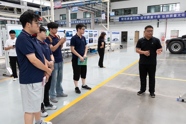 在吉利远程新能源商用车北方生产基地,实践队员随着技术人员的带领与讲解,参观了重卡生产线,醇氢重卡从雏形到完成的制造过程就在眼前。实践队员就甲醇箱、动力电池向技术人员咨询,了解燃料成本、性能参数。实践队员听取企业人员介绍汽车行业的能源消耗与排放结构情况,并运用所学的专业知识与认识实习的见闻,与企业人员交流远程汽车“醇氢+电动”两大核心技术路线。