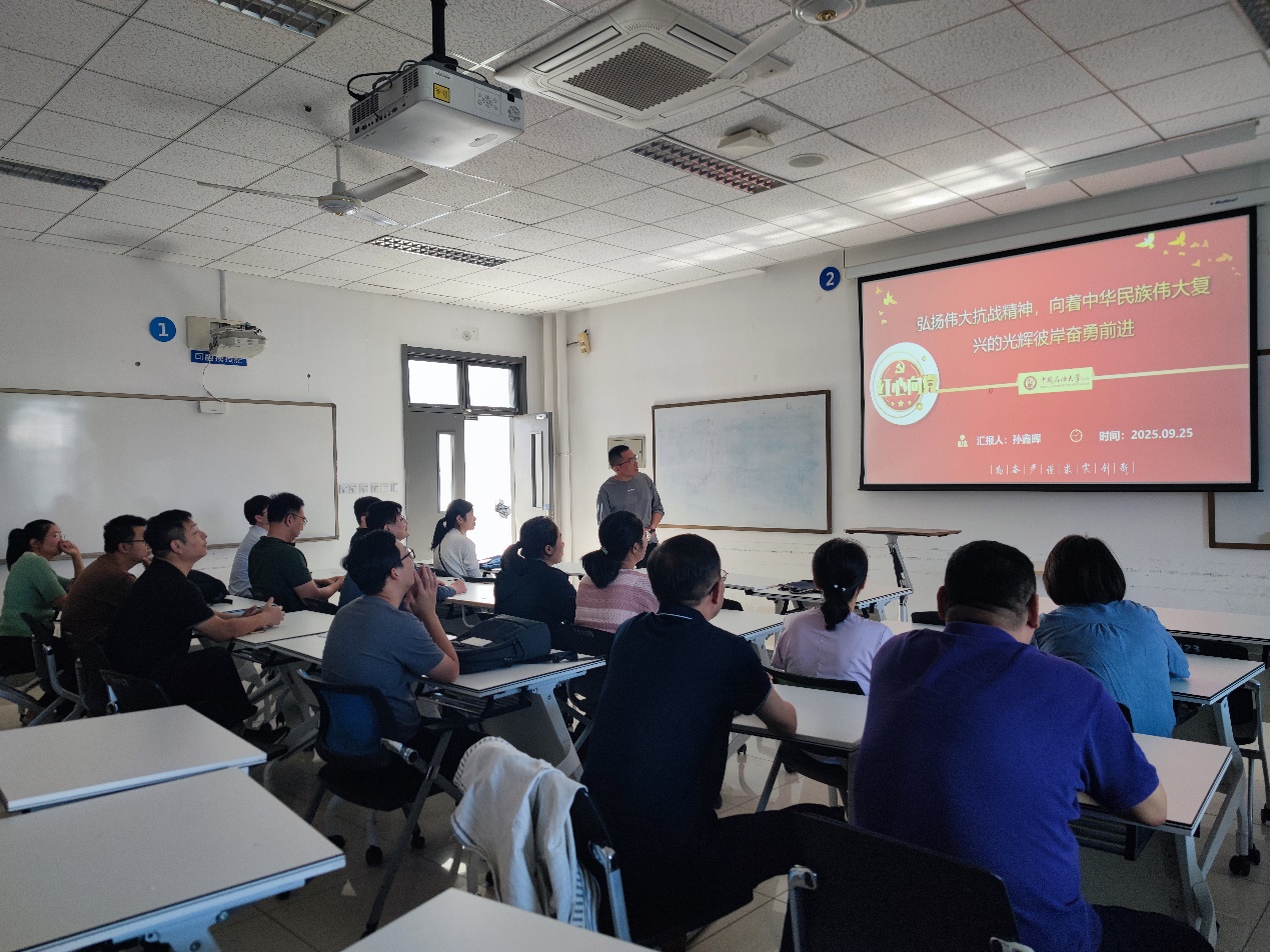 最后,值月党员孙鑫晖老师以“弘扬伟大抗战精神,向着中华民族伟大复兴的光辉彼岸奋勇前进”为题,传达了习近平总书记在纪念中国人民抗日战争暨世界反法西斯战争胜利80周年大会上的讲话精神,回顾了中国人民抗日战争的艰苦卓绝与伟大胜利,深刻阐释了抗战精神的内涵与时代价值。抗战精神是激励我们克服一切艰难险阻、实现民族复兴的强大动力。结合当前国际形势与历史虚无主义现象,呼吁全体党员牢记历史、捍卫真相,在新时代教育战线上发扬斗争精神,坚守育人初心。