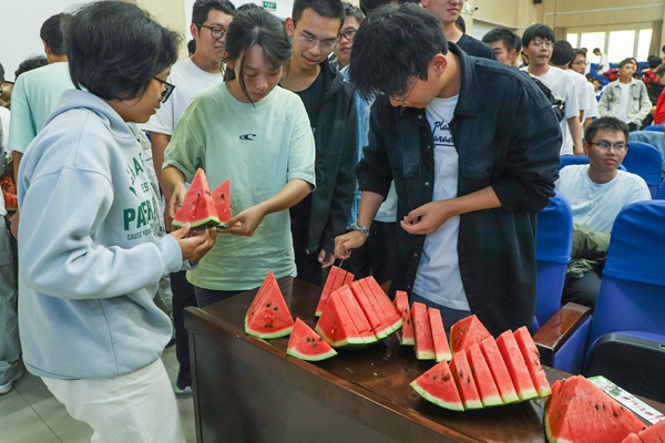 大会伊始,学生心理健康教育中心徐铭雪以“在不确定的世界里,选择拥抱变化”为题,引导新生重视心理健康,为新生逐步适应大学生活筑牢心理防线。心理宣讲结束后,大会氛围迎来温馨转折。辅导员张子良兑现军训期间对新生的承诺,分发饮品,同时为奖励学生在各项军训活动中取得的优异成绩,特别准备了新鲜西瓜,与新生共享荣誉喜悦。在班助有条不紊地切西瓜的过程中,辅导员张子良向新生介绍大学与高中的区别,讲解了需遵守的规章制度,同时结合学院发展与新生成长,鼓励学生积极参与校园活动,全面提升综合素养。随着会议接近尾声,新生们有序上前领取西瓜,在轻松的氛围中交流心得并依次离场。