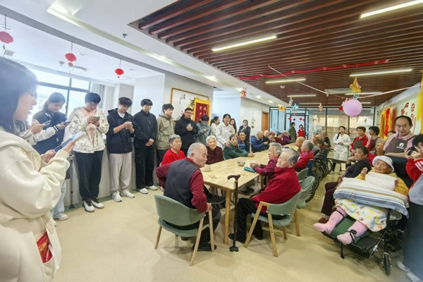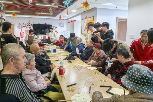 活动现场温情满溢,团员们整齐颂唱《我和我的祖国》《紫荆花盛开》,熟悉旋律缓缓流淌,不少老人轻拍手掌跟着哼唱,眼中泛起对岁月的温情追忆;扇面绘制环节里,团员与老人一对一结对,一笔一画勾勒美好,“平安健康”“事事如意”等真挚寄语跃然扇面,承载着对美好生活的向往;“你划我猜”游戏更是点燃气氛,团员们生动演绎贴近老人生活的词语,老人们踊跃抢答、笑声不断,年龄隔阂在互动中悄然消融。活动尾声,大家齐唱《我爱你中国》,激昂歌声凝聚着两代人对祖国的赤诚热爱,感染着现场每一个人。活动结束后,团员们主动协助护工,小心翼翼搀扶行动不便的老人回房,用实际行动彰显新时代青年的责任与担当。