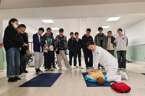 培训期间,医护人员提到,心脑血管疾病已经成为影响人类健康的头号杀手,需提高心源性猝死时的救治能力,抓住挽救生命的“黄金四分钟”。医护人员系统讲解了心脏骤停的原因、类型和表现,并且借助人体模型形象地演示了从现场评估、判断反应、快速呼救,到胸外按压、开放气道、人工呼吸的心肺复苏完整流程,说明了心肺复苏的成功指标与终止条件。随后,医护人员从功能、分类上介绍了自动体外除颤仪以及其使用方法和注意事项。在讲解海姆立克急救法时,医护人员用“肚脐眼上方剪刀石头布”这一口诀,让同学们迅速掌握了其关键动作要领。