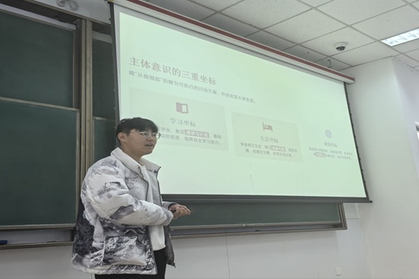 班会伊始,班长孙浩鑫以生动的引导与图文资料,详尽介绍了大学生活中树立主体意识的重要性。孙浩鑫提出主体意识的三重坐标,分别在学习,生活,规划的方向为大家给出了有力指引。其次,孙浩鑫又结合校园安全管理规定,讲解宿舍火灾预防要点,重点说明插线板使用规范、易燃物品存放要求等内容,带领班级成员开展了关于宿舍火灾安全自检的互动讨论,有效地唤醒了大家“居安思危”的防范意识。