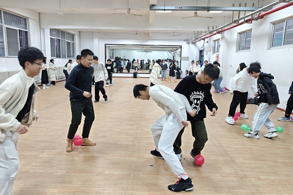 活动伊始,团支部成员在文体委员的带领下通过体育热身为接下来的运动环节做足准备。随后活动在第一场游戏“接力运球”中拉开序幕,成员们用筷子夹住乒乓球进行往返接力跑,看似简单却充满挑战,不仅带动了成员们的积极性,也消除了初见的陌生感;紧随其后的便是“螃蟹赛跑”游戏,成员们两两一组,背对背夹住篮球进行接力跑,有的队伍健步如飞,稳稳把控着节奏;有的队伍虽初遇磨合,多次失误,但成员们快速调整节奏,相互配合,坚持完成了比赛,完美展现了不轻易气馁的体育精神。经过两轮趣味十足的热身游戏之后,活动进入了激动人心的“踩气球”环节。成员们分为五组,在自己的两个脚踝上分别绑上颜色各异的气球,目标是保护好自己的气球并踩爆其他小组的气球。随着团支书宣布比赛开始,现场瞬间化为欢乐与竞技交织的战场,有的队伍商定战术,用灵活的走位护住己方的气球;有的队伍主动进攻,精准瞄准对方的气球发起进攻。此起彼伏的欢笑声,将现场的氛围推向高潮,拉近了成员之间的距离。