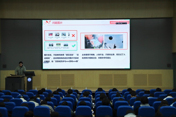 最后,薪火传媒中心主席团成员杨恒康结合实践经验,分享了投稿流程、新闻稿件撰写要求、照片拍摄要求等实用技巧,并指出了稿件中常见的问题,帮助学生掌握提升新闻稿件质量的实用方法。