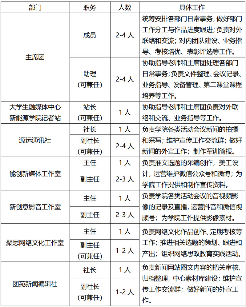 目前,薪火传媒中心下设源远通讯社、能创新媒体工作室、新创意影音工作室,为适应宣传工作的新需求、新形势,推进学院入驻古镇口校区的思想文化阵地建设,践行使命担当、彰显青春作为,中心将增设聚思网络文化工作室、团苑新闻编辑社。现开展薪火传媒中心2026-2027学年学生管理团队的换届工作,公开选聘主席团和各部门负责人。具体事宜如下: